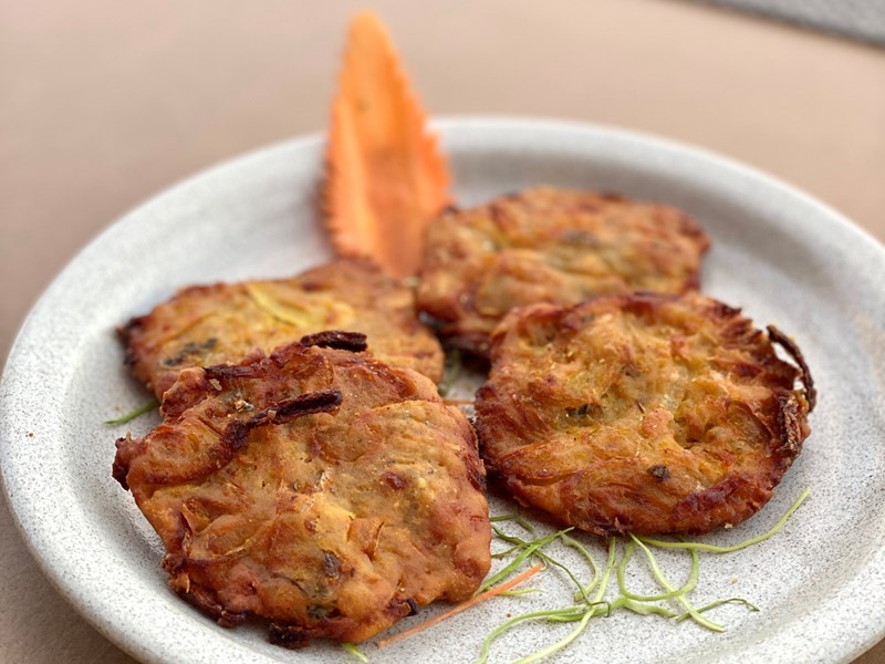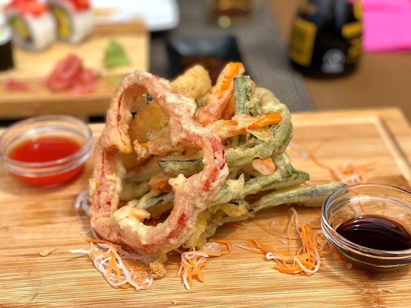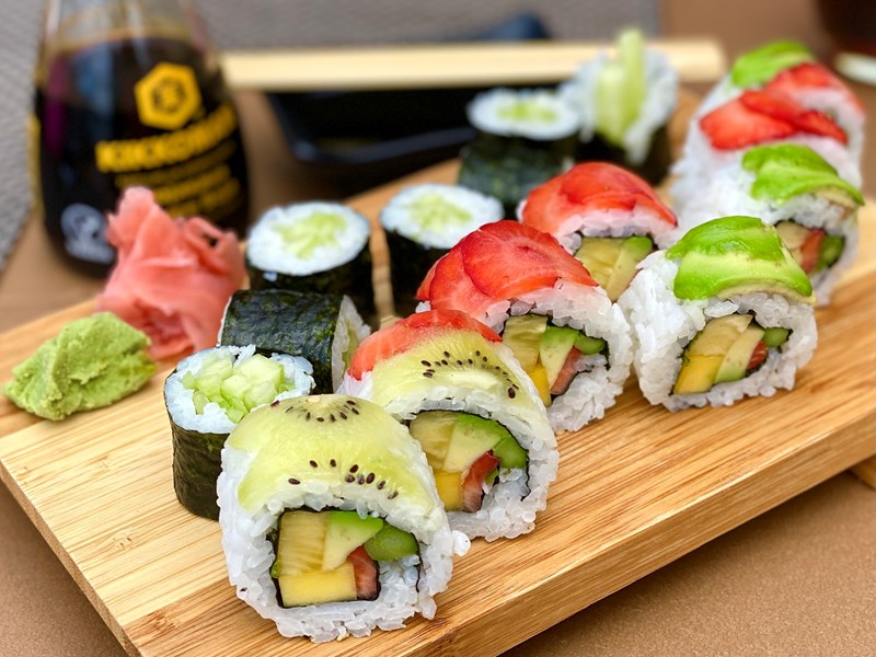 Colorful vegan sushi with fruit, all kinds of Indian snacks (such as onion bhaji, aloo pakora, vegetable samosas, onion rings and vegetable tempura), dahl curry, mixed vegetables curry (my favorite), started tarkari with eggplant and Kathmandu tarkari.