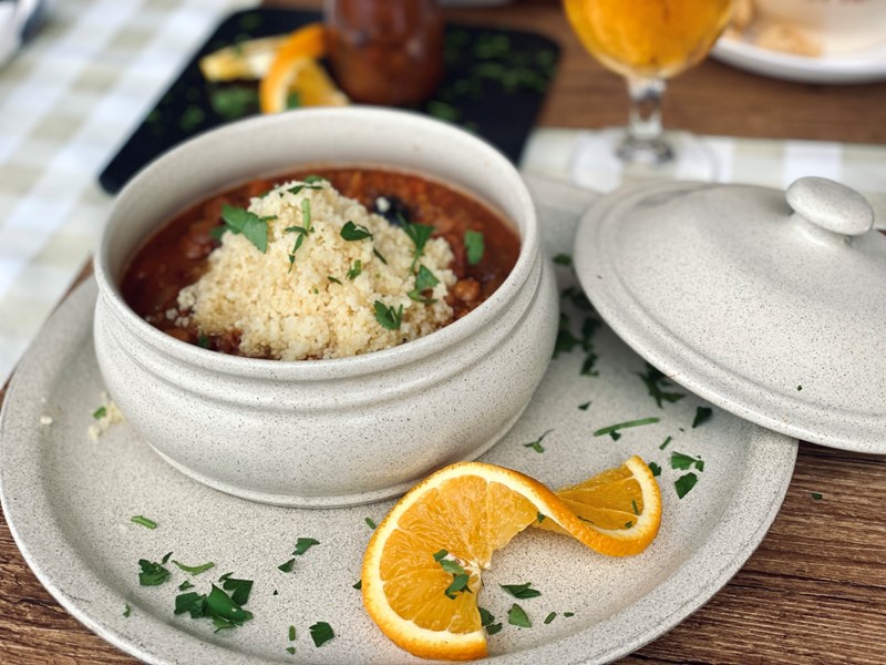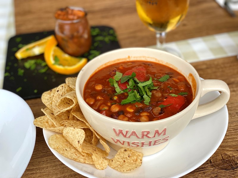 Bolo do caco with vegan garlic butter, a Moroccan tagine (with aubergine, chickpeas and couscous, a favorite!), a Veg Chili with mixed beans, red pepper and chipotle sauce and for dessert a very original, warm strawberry-rhubarb crumble. Yum!