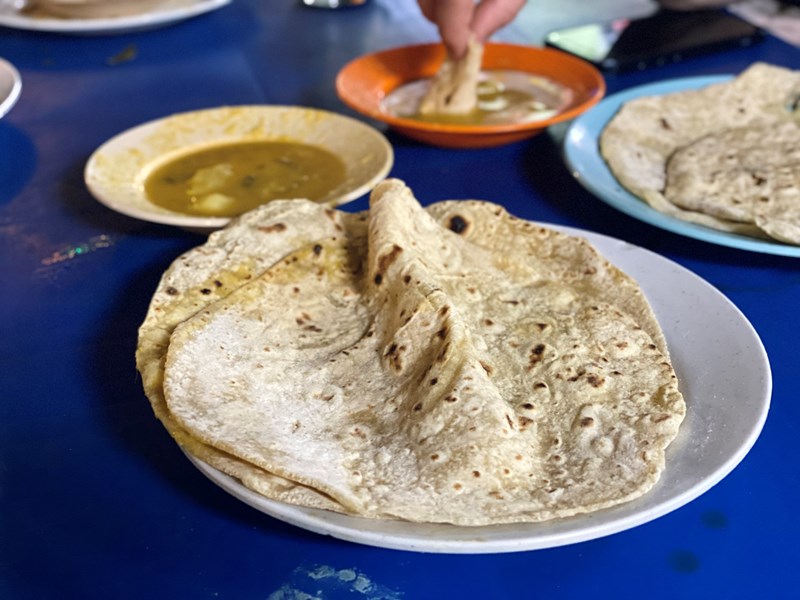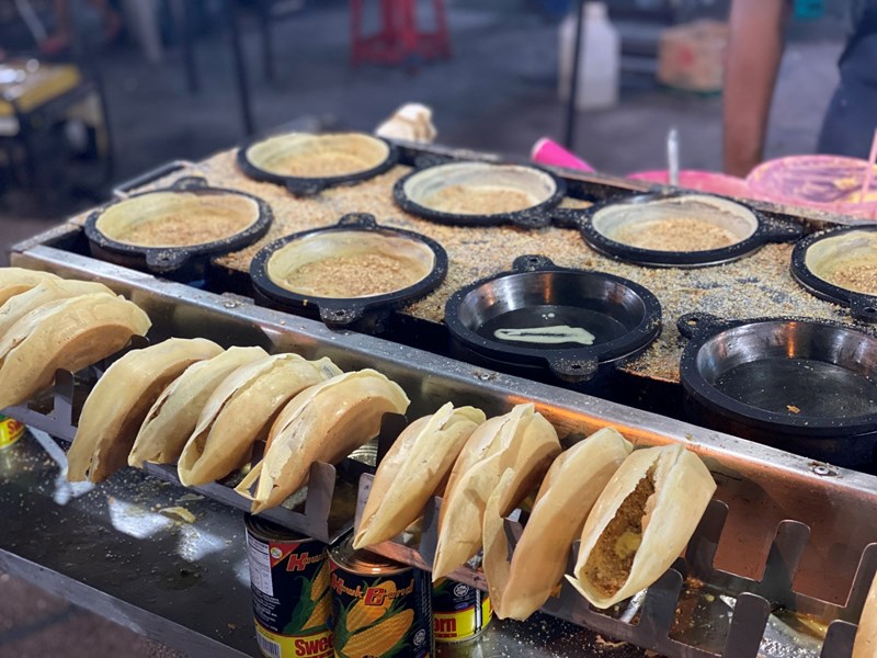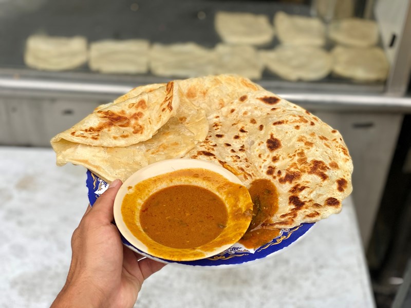 - 7 - Roti canai - very common street food in Malaysia. Very often made with egg or butter, but not always. So search a little. These were fantastic. I found them at the T.S. Bismi at the foodmarket on lebuh tamil. The dahl with it was also delicious. Note: it is a breakfast thing, so in the afternoon you will less easily find them.
