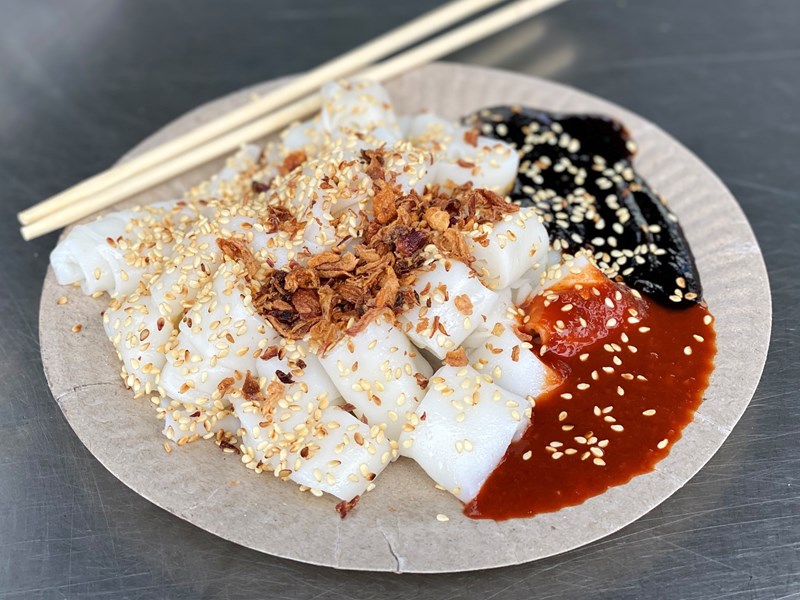 - 2 - Tee cheong fun - a thick, chopped rice noodle with a dark soy sauce and a spicy sauce. Note: normally with another sauce that contains shrimp paste. Ask to omit this!