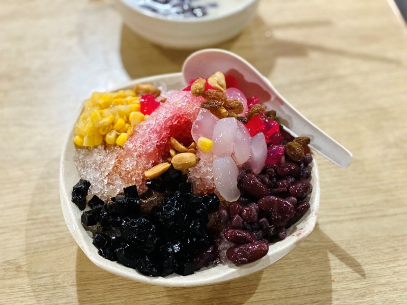 - 6 - Shi gua th'ng - I saw everyone eating this too. Jelly's, lychees and - yes - sweet potato in ice water. Special? Yes. Yummy? No. I bought this at shi tan shui pu on kimberly street.