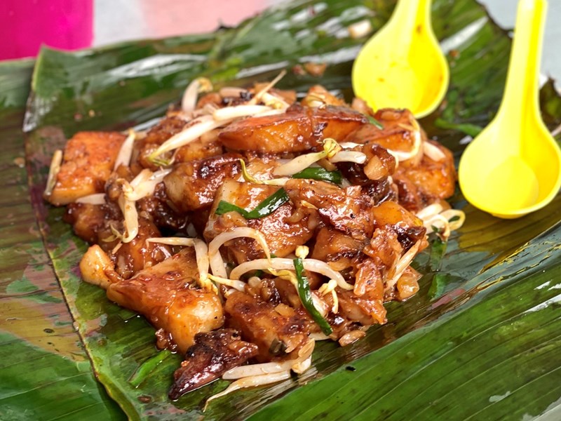 - 1 - Char koay kak - fried rice cake in dark soy sauce. Often with egg, fish or shrimp, but they can omit this. It is really delicious, with a slightly soggy bite full of flavour.