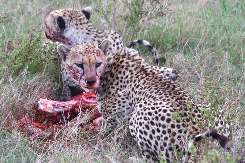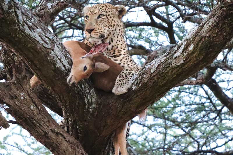 Throughout the year, the great migration takes place, with large herds of millions of grazers following the rains (where there is rain, there is fresh grass and water), which shifts clockwise across the Serengeti. In October, when we visited, the rain was in the far north, so we arrived in the south in a dry, yellow landscape. This makes the animals that stay behind easier to spot. In the southern part, we saw several cheetah hunts and many leopards, lions, hyenas and other predators.