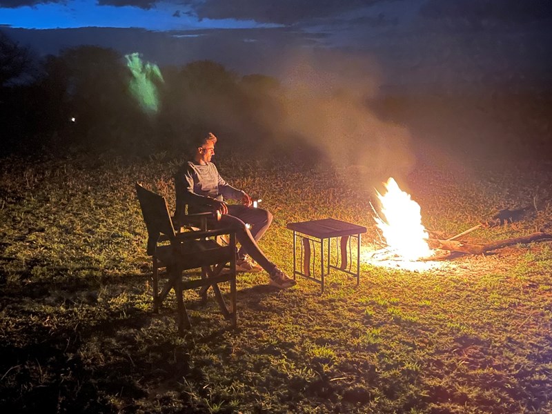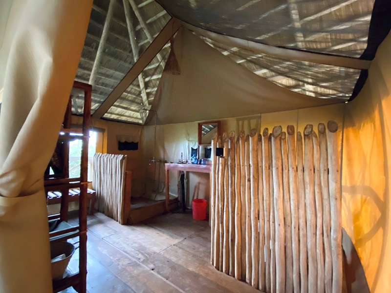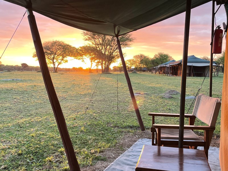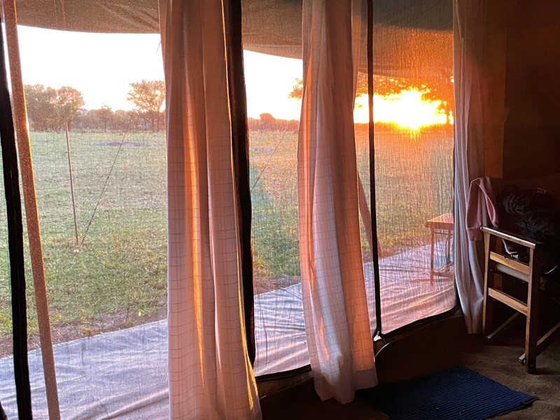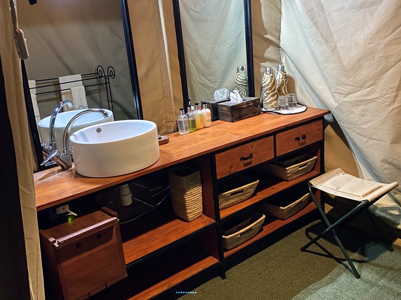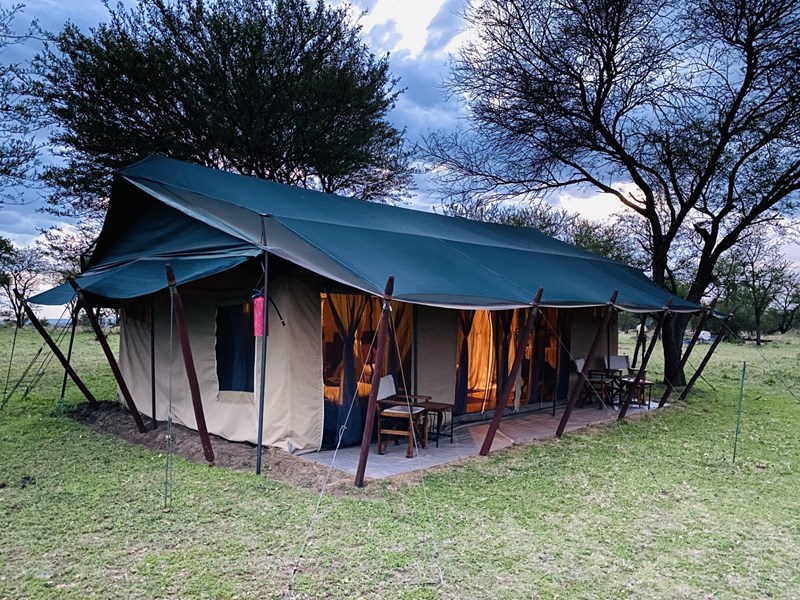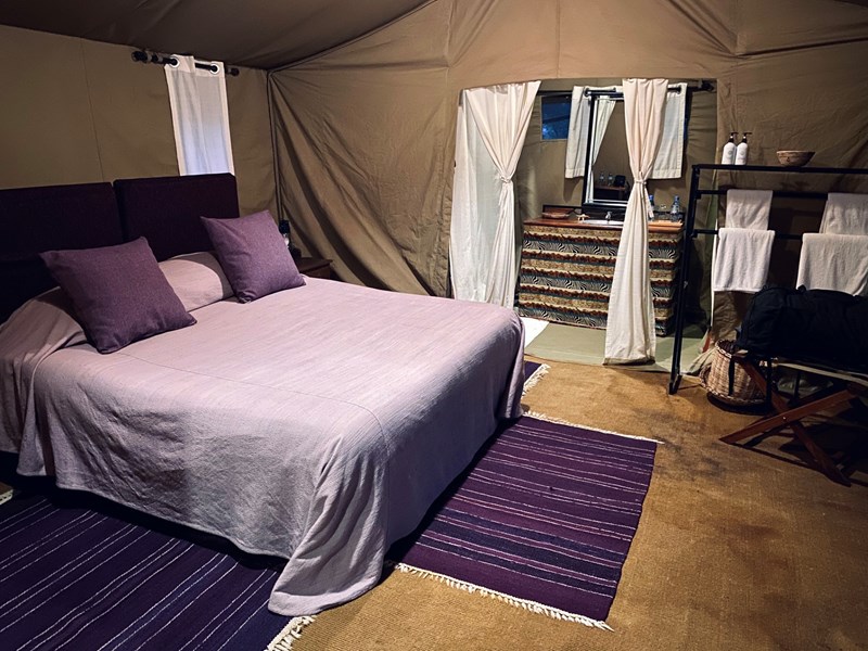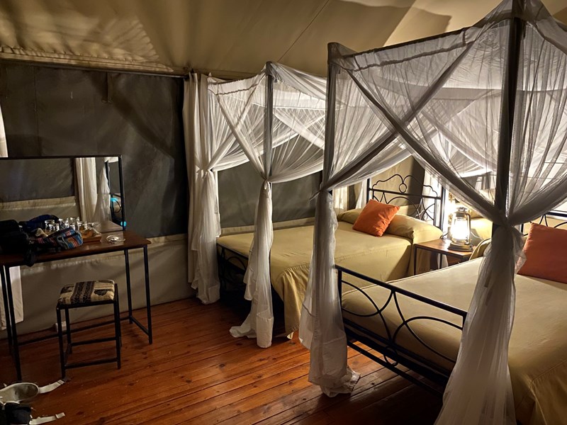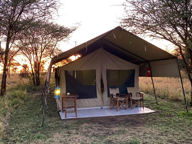 Mara Under Canvas is a tented camp located in the North of Serengeti National Park near the Mara River, so ideal as a basecamp if you're here for the river crossings. It is a stunning, comfortable and luxurious tent with wonderful beds, a warmer shower (Water for the shower is usually heated over the fire at these accommodations and poured into a bucket next to the tent, after which you can let it run out of your shower with a handle yourself. Ingenious system!). The staff will light the fire for you and bring wine and even popcorn. Because the herds were here at this time, we constantly heard the wildebeest and zebras around the tent, which was amazing.