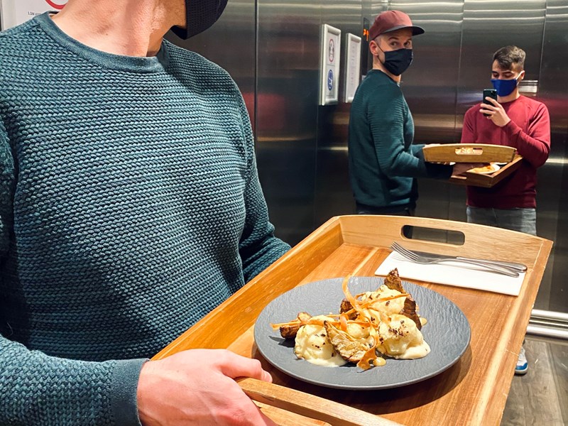 Of course, their sustainability mission is clearly visible in their restaurant. The chefs use locally and seasonally produced ingredients (many in their own herb garden) with short supply chains and a zero-waste policy to create delicious dishes. Because of the pandemic, we were invited to try out their weird but fun dine-in-your-room experience, where they set the table in our room with a stunning view over the IJ lake. We received a call every time the next course could be picked up at the lobby. The courses were both original and delicious.