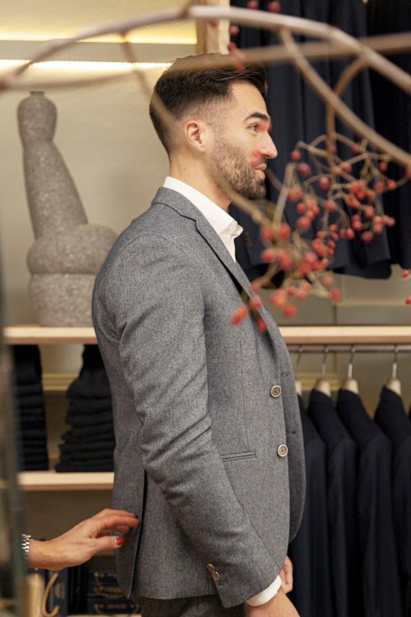 Ik vond het zó bizar dat dit nog zo moeilijk was! Pogingen bij verschillende andere partijen liep op niks uit. Het was steeds nét niet wat ik zocht. Wel vegan maar echt niet per se duurzaam, of wel vegan maar net niet mooi of van de hoogste kwaliteit, of de hoofdstof was (per ongeluk) diervrij maar over details was niet nagedacht. Aarden Respectful Tailoring is al sinds 2012 koploper op het gebied van duurzame maatpakken, trouwpakken en colberts, maar vegan opties ontbraken nog in het assortiment. Toen ik Erik vroeg of hij iets voor mij kon betekenen, ging hij de uitdaging aan! Het stond al een tijd op z’n wensenlijst om een vegan pak tot op de bodem uit te zoeken, maar hij wist dat het nogal een uitzoekwerk vergt om 100% vegan te verzekeren.