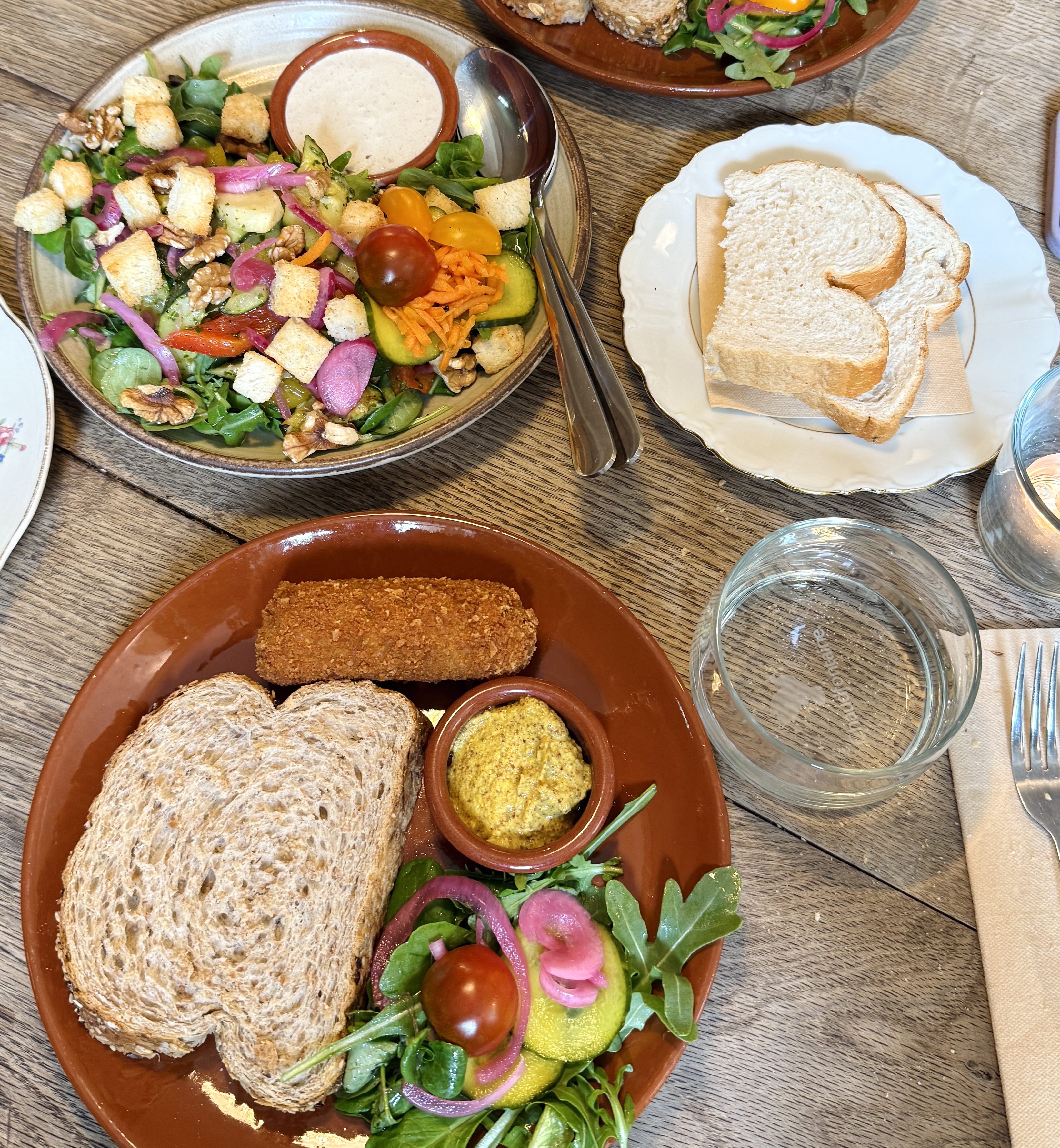We sloten af bij het gezellige, door bloemen omgeven Dagcafé Opmaarhuizen in Winsum. Daar genoten we van lokaal brood, frisse salades, broodjes met vegan kroketten en tot slot heerlijke zoetigheden.