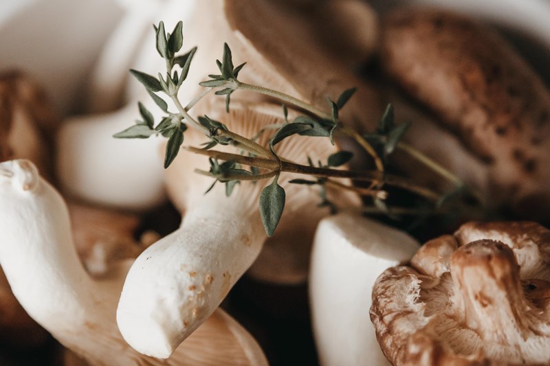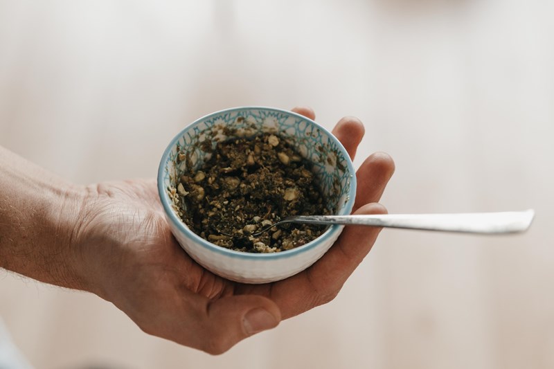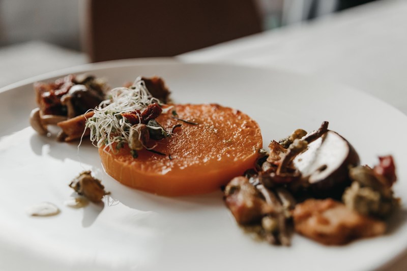 Hoofdgerecht: Pompoen met paddenstoelenmelange, ‘kip’ en pistachepesto.