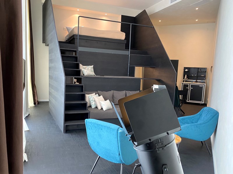 The Almodovar Hotel has rooms of many different types and prices, but I believe that we were lucky enough to stay in the very coolest. The incredibly spacious loft suite has 5-meter high windows and curtains, a little industrial kitchen station, a modern bathroom and its comfortable bed situated on top of a 'stage' overlooking the room. The built-in sofa's make it such a cool hangout, we almost didn't want to leave the room! Everything was perfectly clean, too.