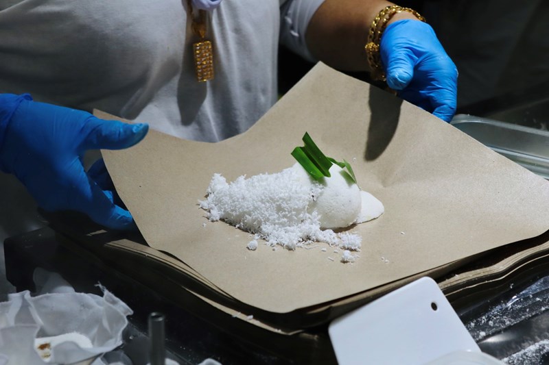 De belangrijkste reden om Haig Road Food Centre of Geylang Serai Food Market te bezoeken is voor de enige echte Haig Road putu piring. Putu piring at Haig Road was de ster van de Singapore-aflevering van de Netflix-serie 'Streetfood Asia' en we keken er al naar uit sinds we erachter kwamen dat het vegan is. Het is gemaakt van gestoomde rijstmeel met warme, gekarameliseerde palmsuiker, geserveerd met pandan en kokosrasp.