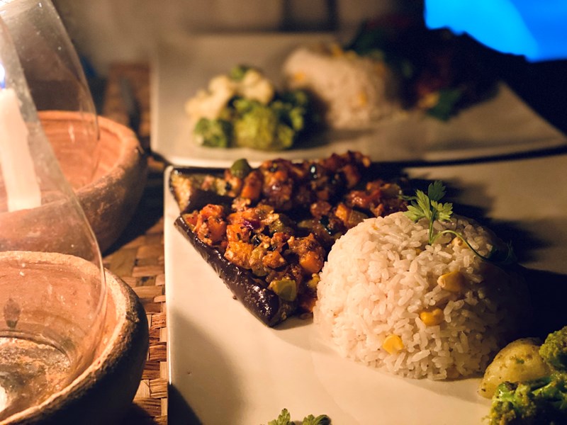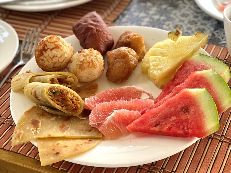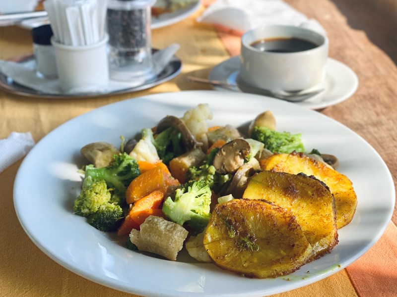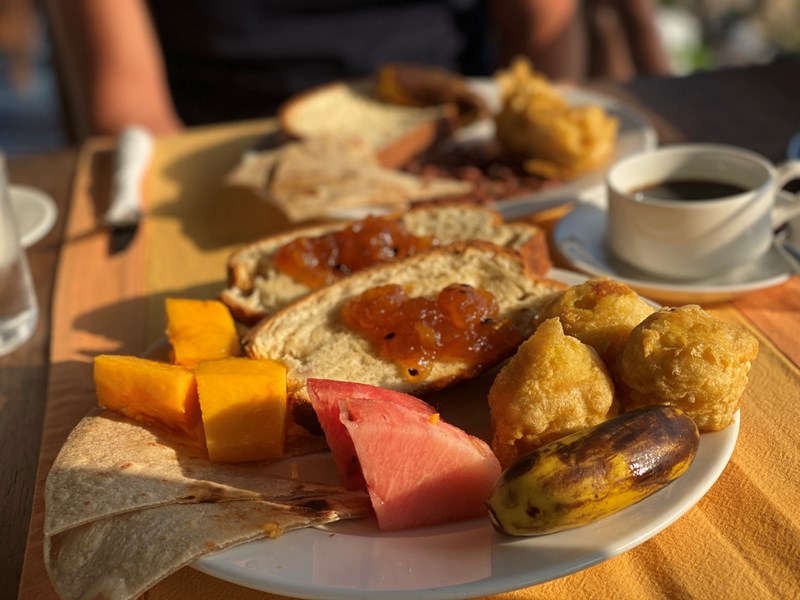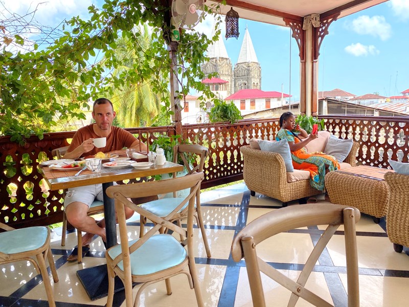 We hebben hier alleen ontbeten, wat toevallig erg vegan-friendly was. Het personeel laat je graag zien welke traditionele Zanzibari-gerechten vegan zijn en welke niet. Gelukkig is heel veel Zanzibari voedsel volledig plantaardig, zoals je kunt lezen in dit artikel over vegan streetfood van Zanzibar.