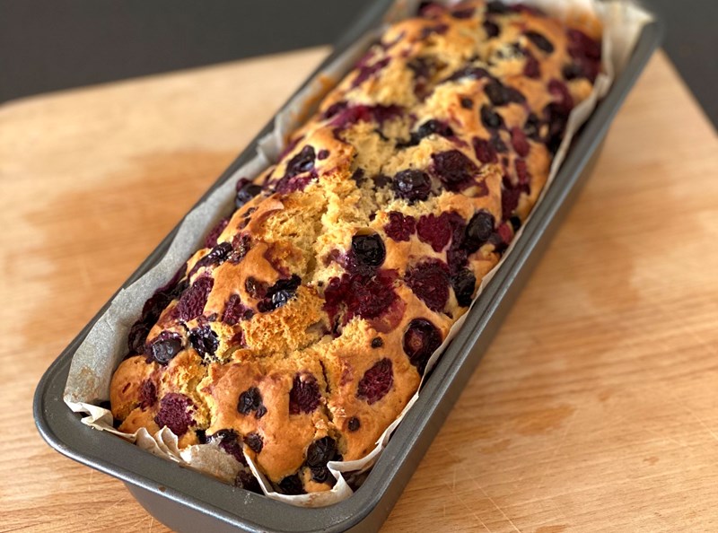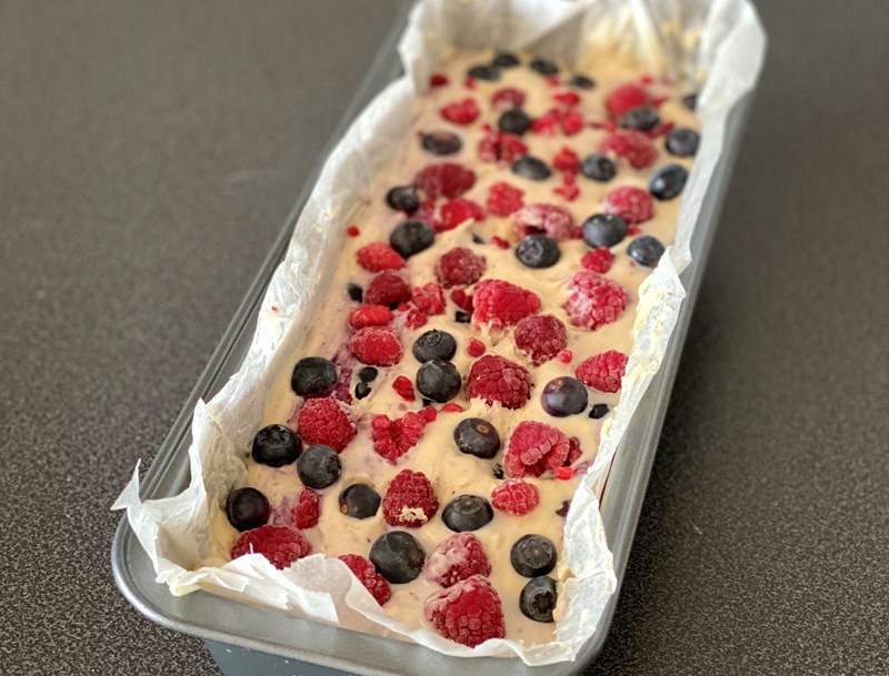- Vet je schaal of cakeblik in en verdeel de mix gelijkmatig. Verdeel tenslotte nog wat bessen en frambozen over de bovenkant en smeer nog wat van de melk uit om de bovenkant donkerder te laten kleuren.