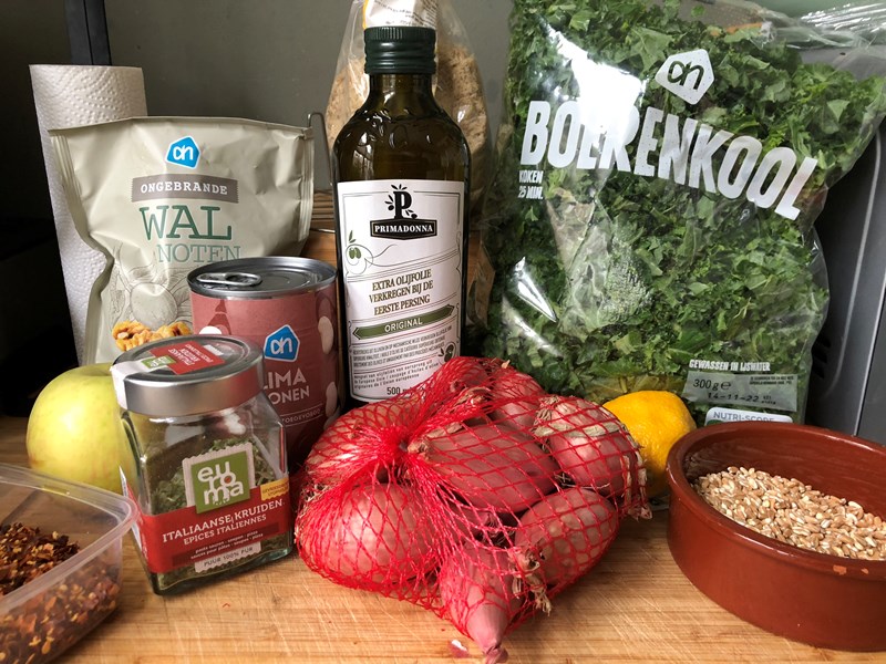 - Snijd de appel in dunne partjes. Snipper de sjalot. Meng de granen met de bonen, boerenkool, appel, sjalot en walnoten. Besprenkel met edelgistvlokken en eventueel chilivlokken naar smaak. Gebruik de marinade van de bonen als dressing.