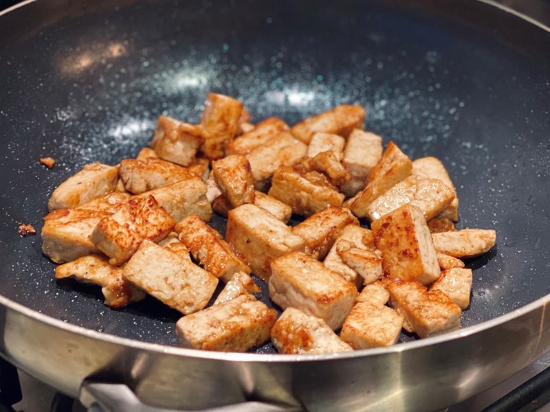 - Verwarm 1el olie in een diepe wok en bak de tofu blokjes gedurende 6 minuten op hoog vuur goudbruin is. Zet even apart in een bakje.