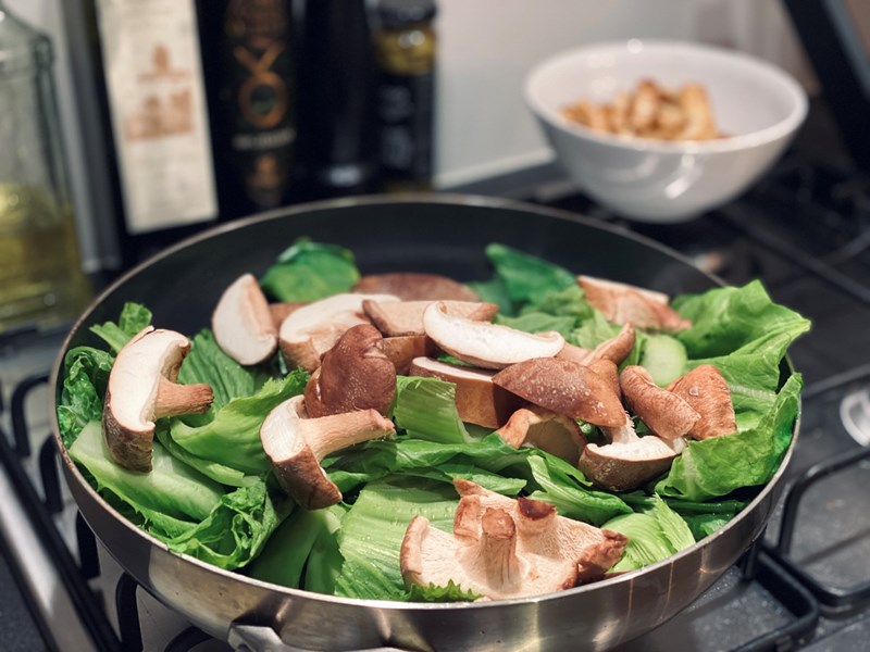 - Snijd de paksoi in grove stukken en halveer de paddo’s.