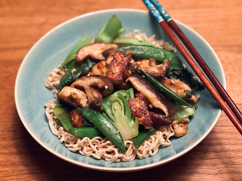 - Wok de sugar snaps, de paksoi en de paddo’s op hoog vuur gedurende 5 min tot ze gaar zijn. Voeg de saus toe en wok samen nog 2-3 minuten. Voeg op het laatst pas de tofu toe en serveer op de noedels!