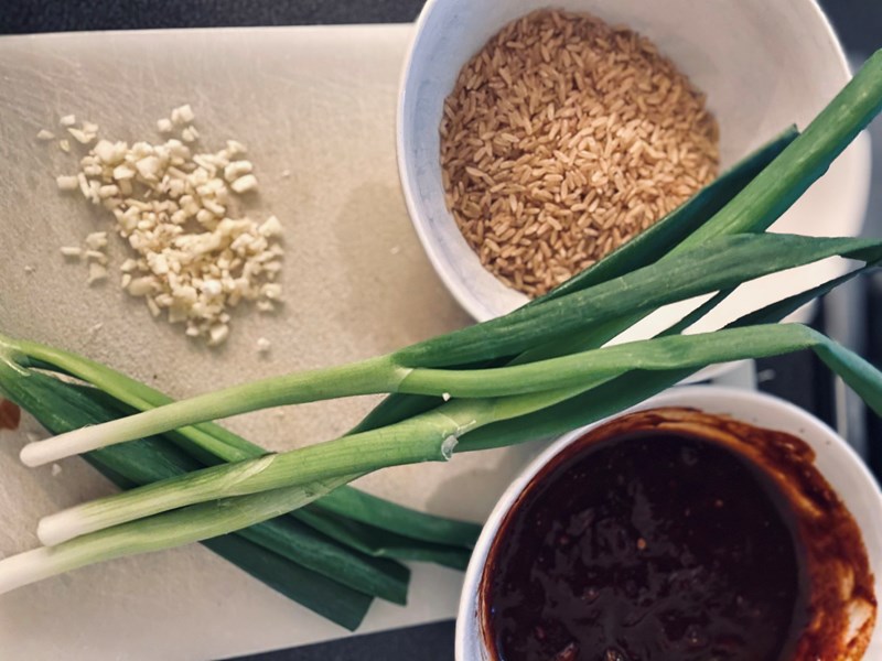 - Serveer met rijst en garneer met bosui