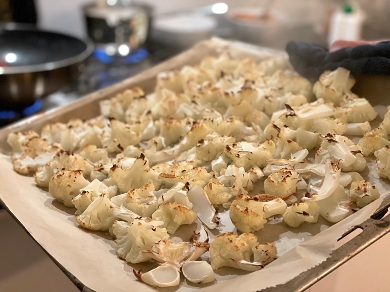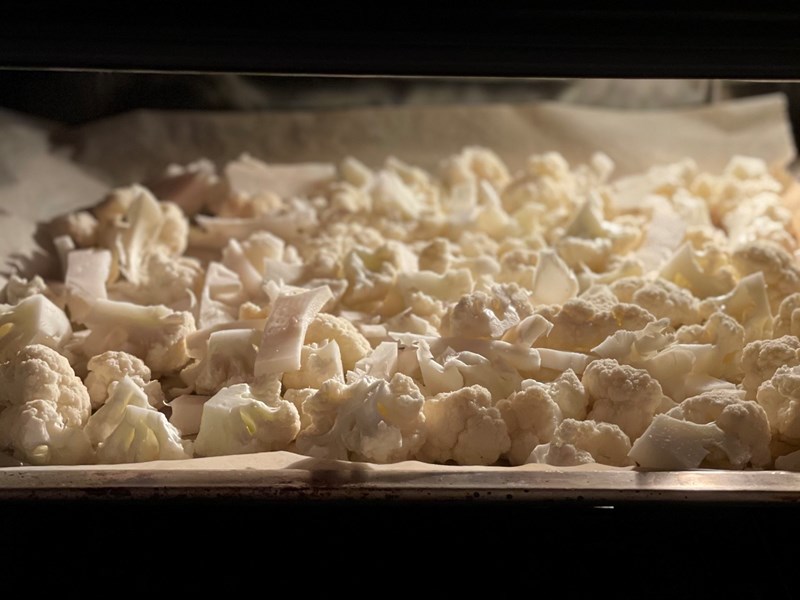 - Verwarm de oven op 200 graden, snijd de bloemkool in roosjes, leg op een bakplaat, bestrooi met peper en een snufje zout en rooster 15-20 min tot ze wat goud keuren.