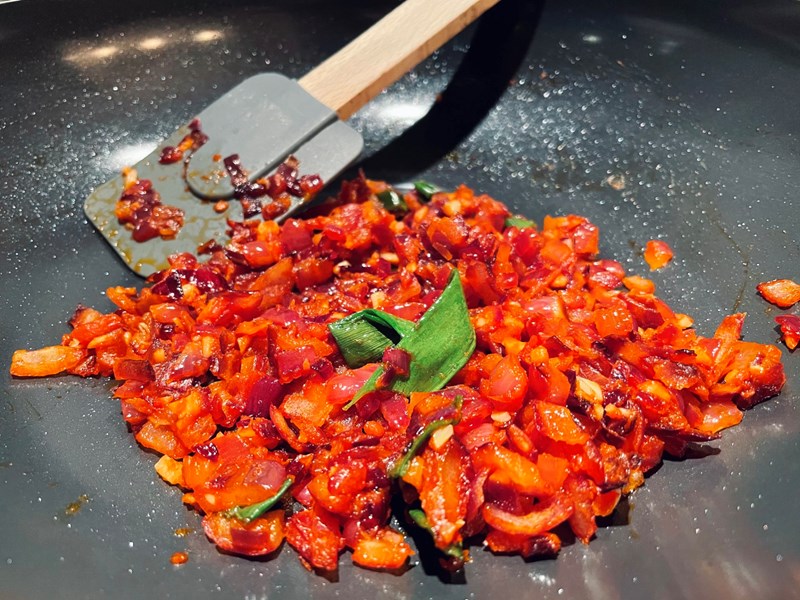 - Saus: mix in een kom de sambal, ketjap, passata, tamarinde en laos.