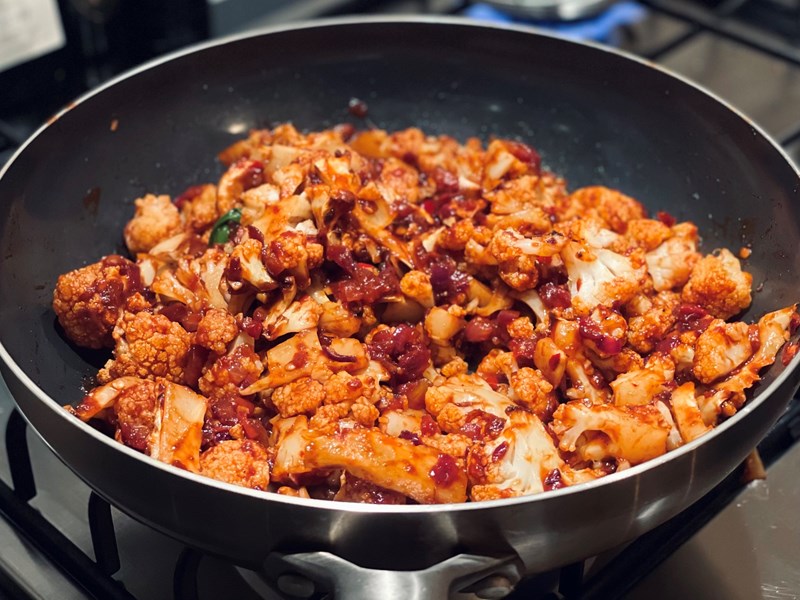 - Voeg de bloemkool uit de oven toe, meng grondig door de saus en verwarm 2-3 min samen.