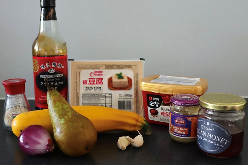 - Mix alle ingrediënten voor de marinade met een staafmixer en marineer de tofu en peer erin (hoe langer hoe beter).