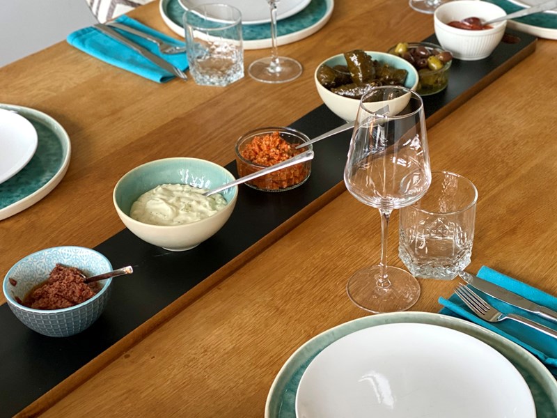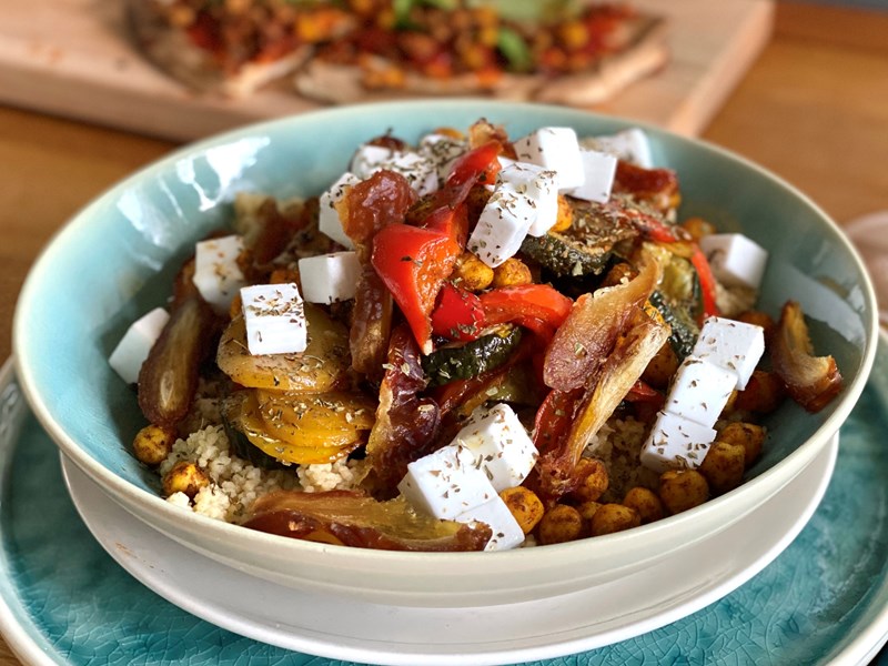 Tip: serveer dit gerecht tijdens een Marrokaans-Turks fusion avondje met vooraf Marokkaanse olijven, dolmades, Turks brood met harissa en muhammara, couscous met gegrilde groente en plantaardige feta en turkse pizza met vegan gehackt.