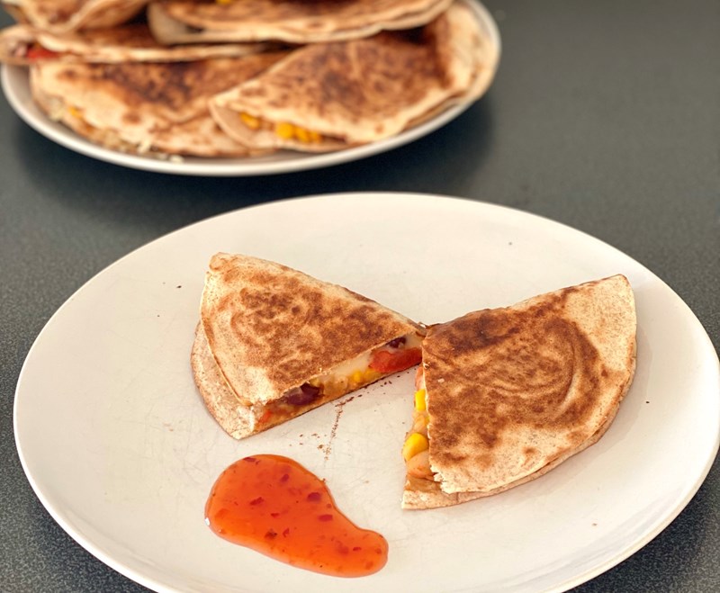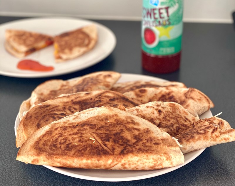- Tip: houd de quesadilla’s die al klaar zijn ondertussen warm in de oven op zo’n 80 graden.