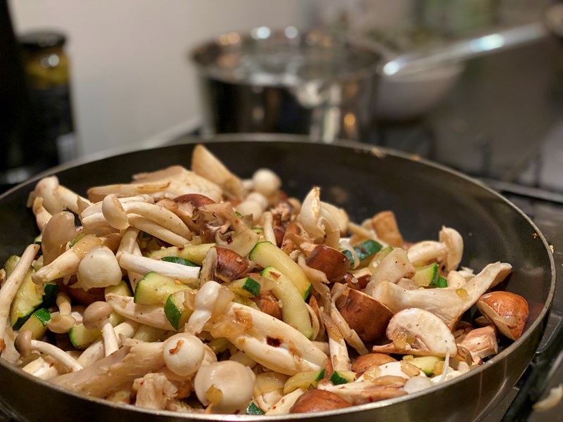 - Fruit het uitje tot glazig en voeg vervolgens de paddo’s en knoflook toe.