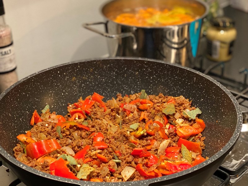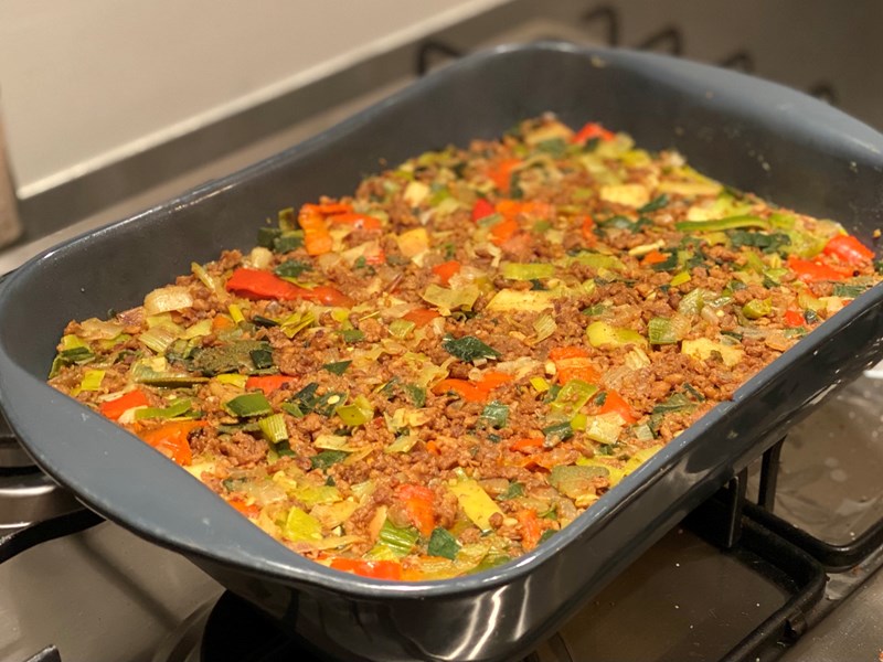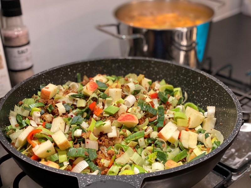 - Voeg het vegan gehakt toe en tot slot de gesneden prei, rode paprika en appel. Bak gedurende 10 min. Regelmatig omscheppen. Voeg peper toe naar smaak.