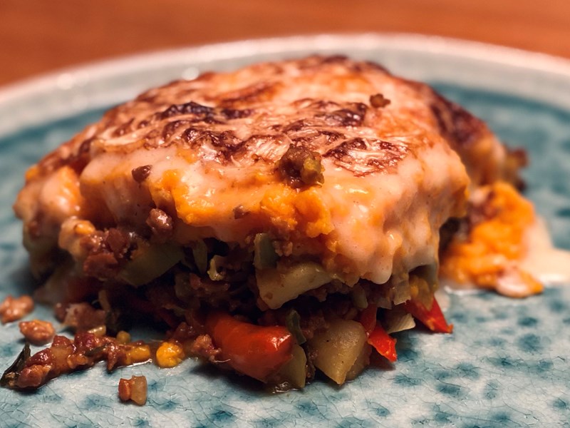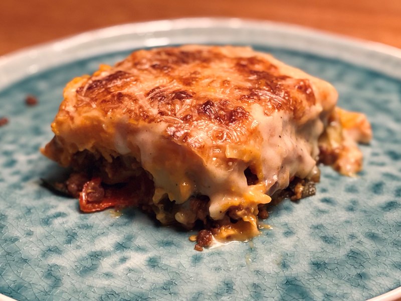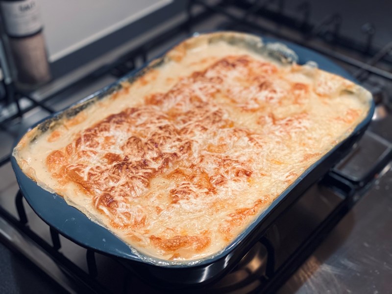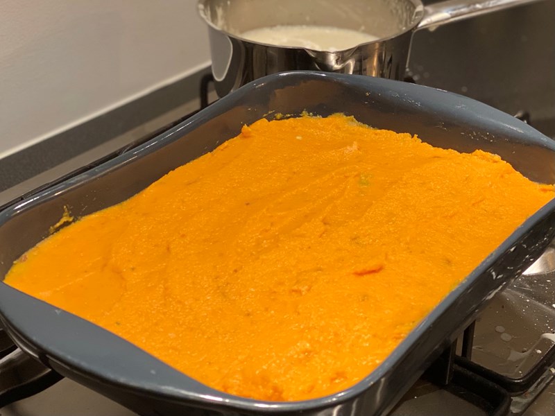 - Verdeel hieroverheen een laagje bechamelsaus en tot slot een laag vegan kaas.