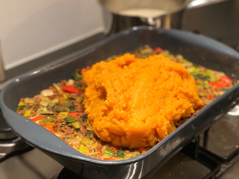 - Verdeel de zoete aardappelpuree eroverheen.