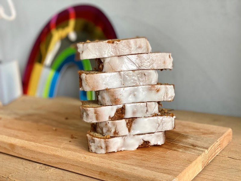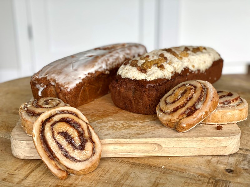 Hieronder zie je hun baby-bananenbrood, cinnamon roll, lemon poppy loaf cake met heerlijke icing, roze en regenboog glacé koeken, walnoten-chocolate chip cookies, cinnamon poppy loaf cake, carrot loaf cake en bio-bananenbrood met blauwe bessen. De laatste twee zijn vrij van geraffineerde suikers.