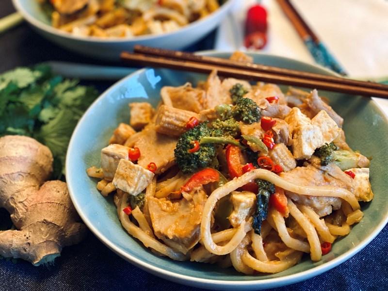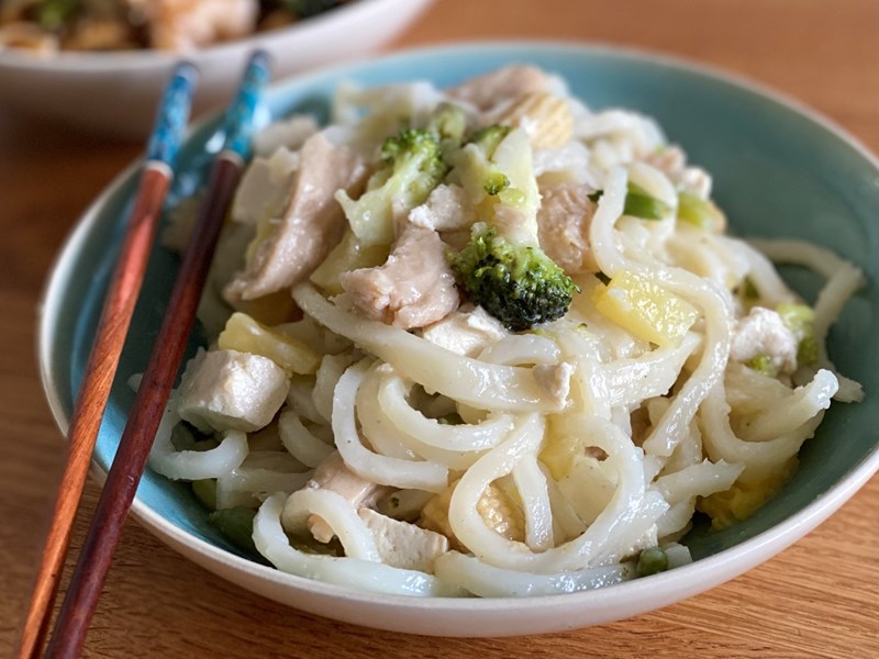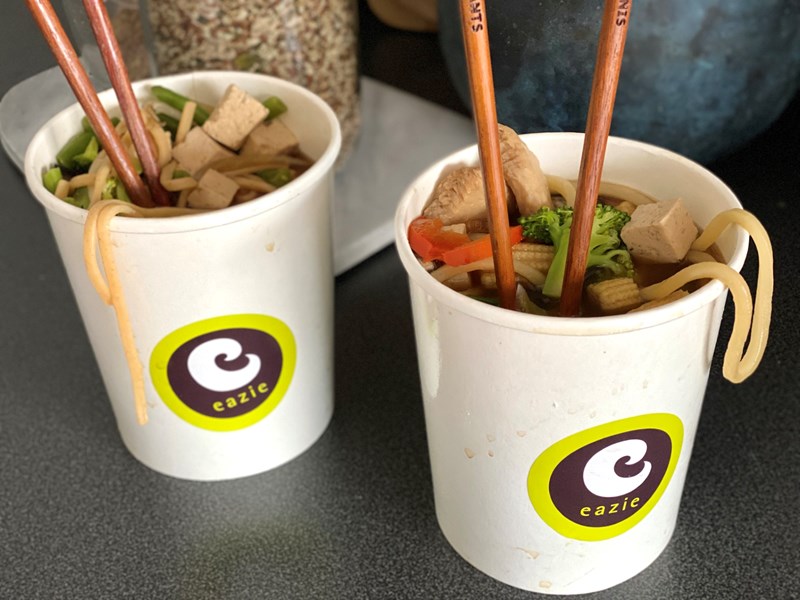 De zelf samen te stellen gerechten is echter wat Eazie voor mij echt een succes maakt. Je kiest je portiegrootte, eiwit, rijst of noedels, saus, groenten en toppings. Uiteraard koos ik altijd voor de Large portie, wat in de bakjes niet eens zo veel leek. Pas wanneer je het uit de bakjes haalt, zie je wat een enorme portie het is. Als eiwit koos ik standaard voor de heerlijke kipstuckjes en hoewel ik rijst, quinoa en noedels heb geprobeerd, steken de udon noedels er voor mij met kop en schouders bovenuit. Ik was hier zó fan van, dat ik snel m'n eigen recept met udon noedels ontwikkelde.